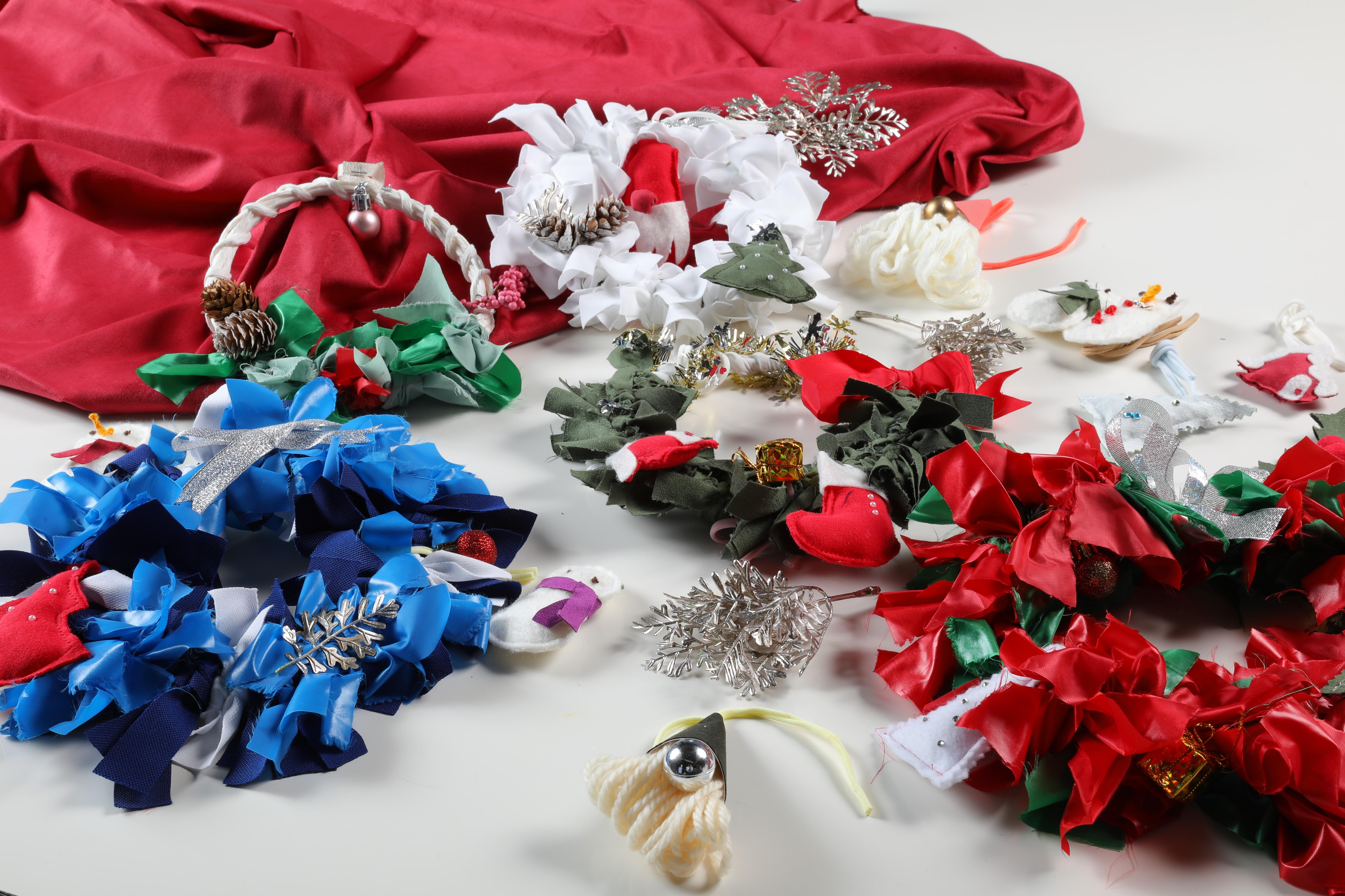 《1》 リースづくり ・色とりどりのハギレ生地を結び付け、オーナメントを飾ってオリジナルのリースをお作りいただけます。